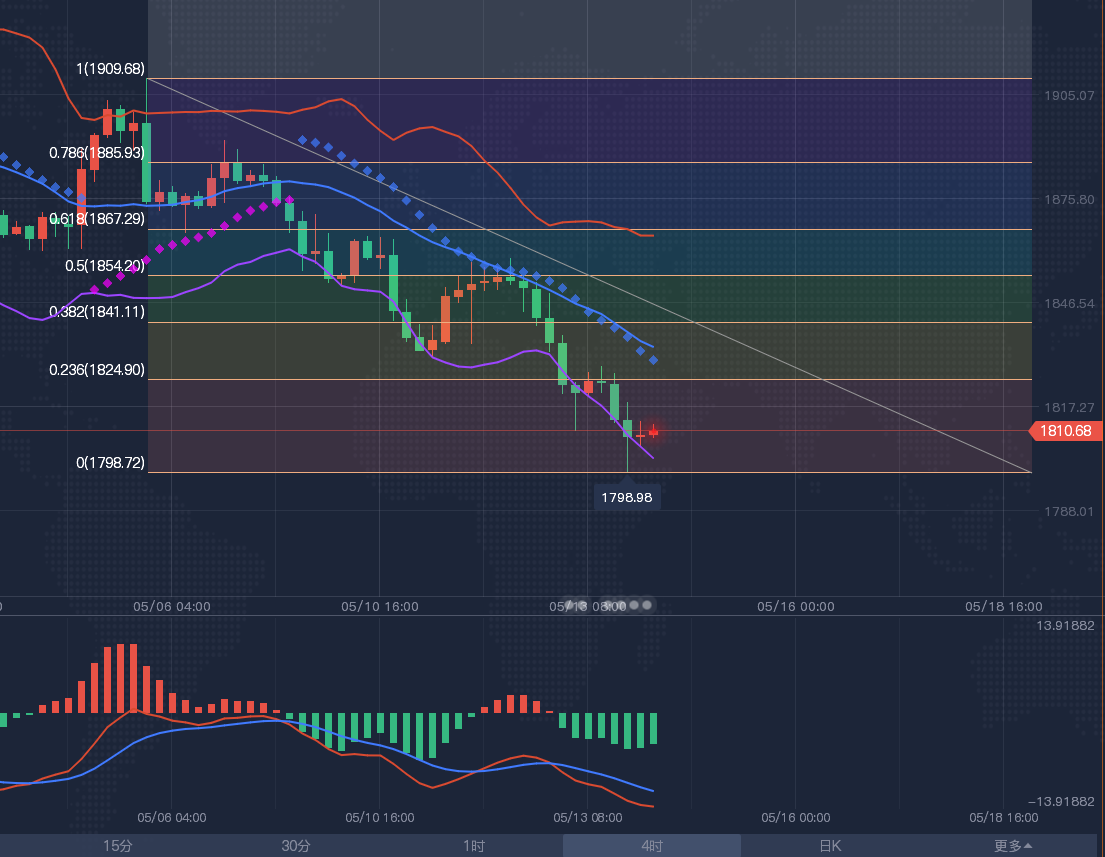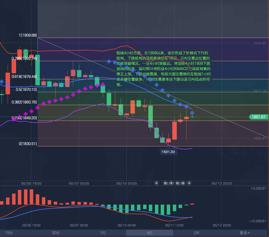 【黄金分析-美黄金】 黄金4小时级别震荡;留意布林线轨道1852-1900区域突破情况;目前KDJ向下发散,ACD初步死叉,留意1850附近支撑,如果失守该位置,则短线偏向再度跌向布林线下轨1840附近,能否进一步下破,还有待观察。A5—A10均线维持死叉下行态势,布林带下轨依然向下开口运行,下方还有一定的