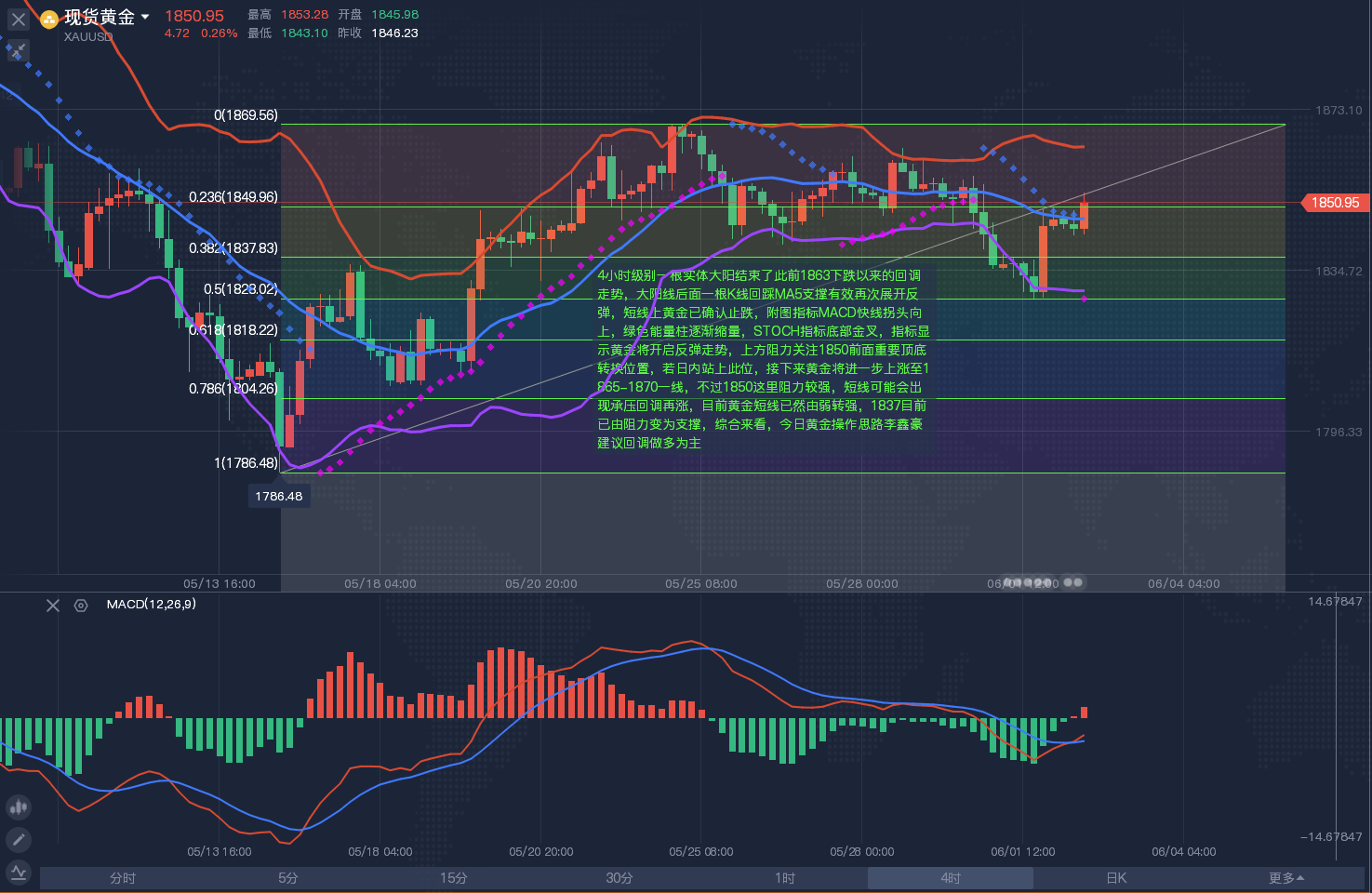 【黄金分析-美黄金】 黄金技术面分析:黄金日线上来看,日线收阳,短线今天整体偏多,连续上涨,日线高点或逐步看1864,1880,4小时周期暂时震荡收口,价位处在布林中轨附近,因此,日内看多但不能激进多,等待回落蓄力后继续多,同时4小时周期的上轨高点在1864,那么,今天回落低多的目标即看1864,美