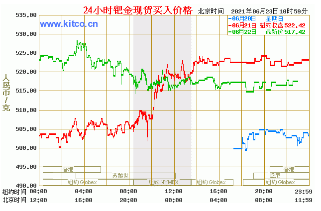 钯金价格走势图今日最新钯金行情(2021年6月23日) 今日最新钯金行情:517.42 备注:以上钯金价格仅供参考,请以官方价格为准。