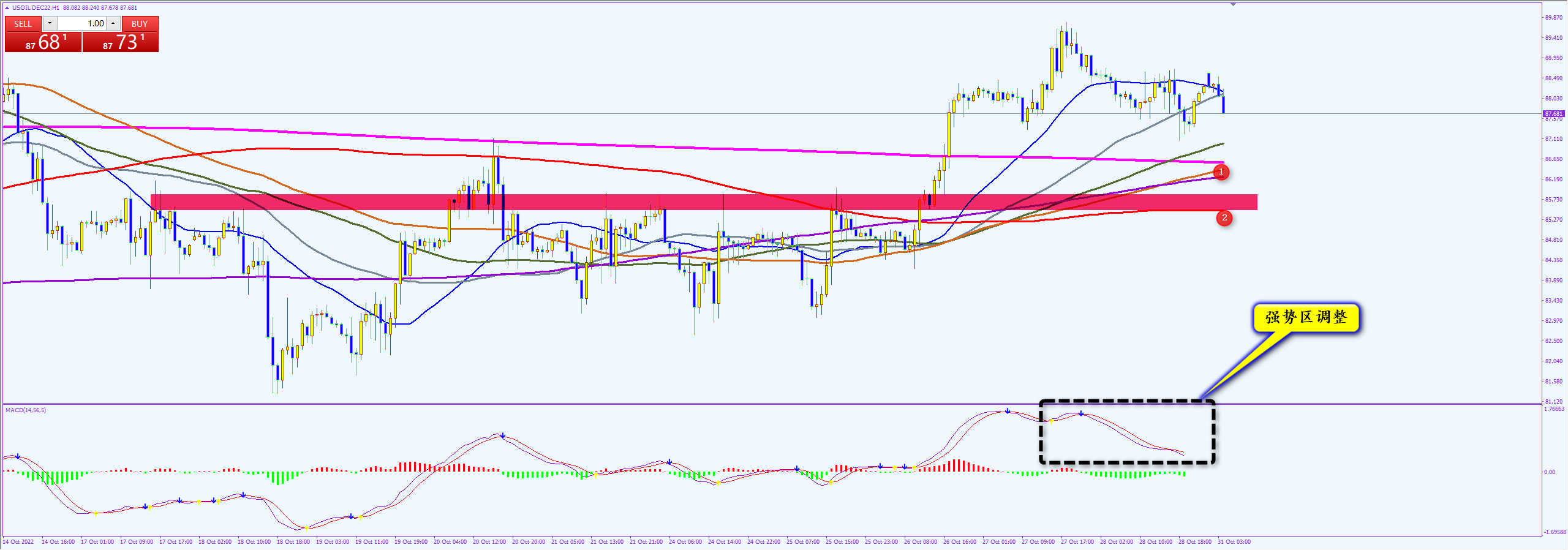 原油87.70和88.80分别做空,止损各70点,止盈各200点;