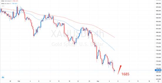3月4日纽市盘中,随着美联储主席鲍威尔讲话的进行,10年期美国国债扩大跌幅,通胀预期指标达到盘中新高,美元继续走强,创逾三个月新高;美国股市扩大跌幅,道指一度大跌750点,纳指跌逾3%;现货黄金重挫20美元跌至1690关口;鲍威尔没有透露如果希望压低长期收益率,会采取什么措施,让一些交易员感到失望。