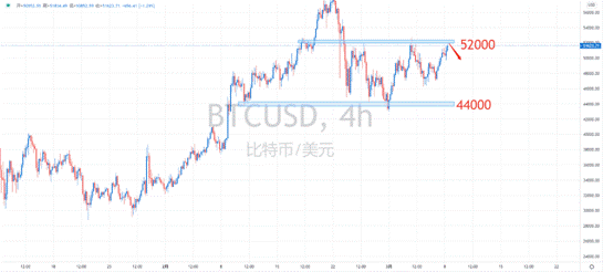 【技术分析】:H4周期,比特币维持多头趋势内高位宽幅震荡,短线投资者可尝试44000至52100区间高抛低吸操作,盈亏比大于2:1即可。