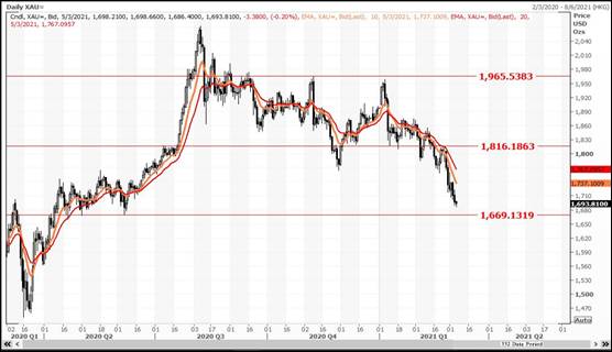 与美元及国债孳息率走向呈反比的黄金,在美元指数及国债孳息率急升下价格下跌,现货黄金下穿1700美元,空头将以2020年6月5日低位1670美元为下一目标,该位置同时亦是5月1日的低位,因此不排除价格到达1670美元附近,空头会进行获利,急弹至1700、1730美元后再向下发动攻势。