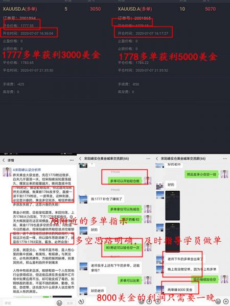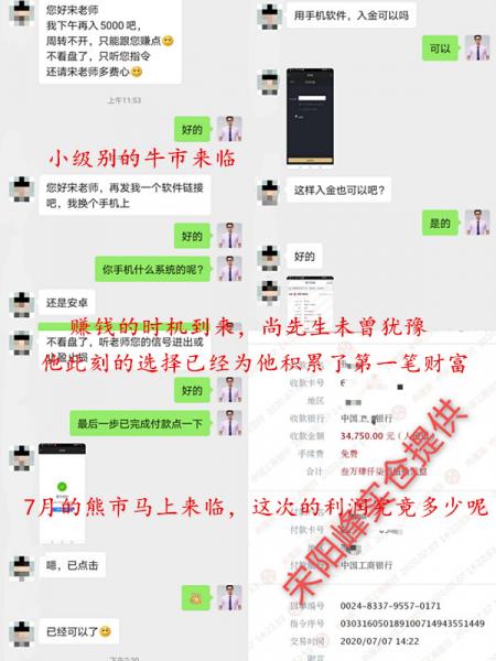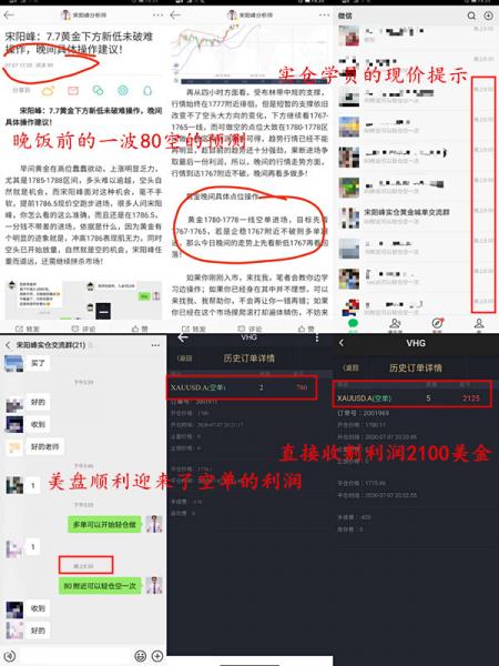 宋阳峰:投资黄金一夜爆赚八千美金,你的老师有带你赚吗? 总是像无头苍蝇一样在论坛上乱找找老师,谁的盈利截图赚得多你就找谁,不知道这一说吗?谁看起来牛你就找谁,结果你进了十个八个群,哪个群喊单准就找谁。等你变成了实仓,结果不用想也知道,你是亏的。在这个漫天遍野都是业务
