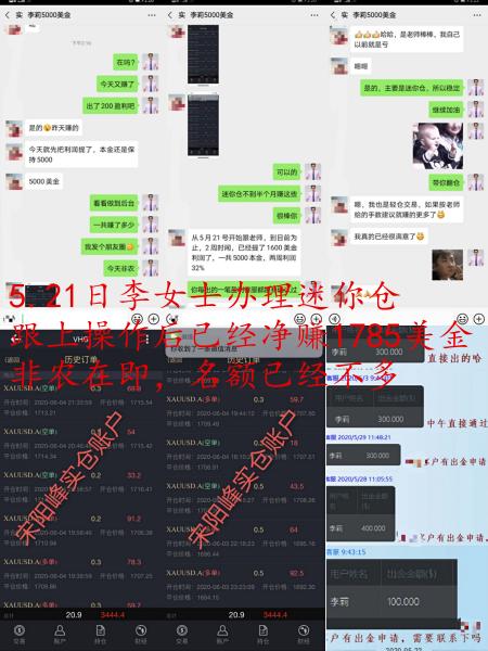 宋阳峰:炒黄金真的能赚钱吗?5万块炒一个月能赚多少? 说实实在在的话,我可以负责任的告诉你能够赚钱,而且还能够赚到不少的钱。因为这个已经不是一个怀疑的东西了,因为我也每天都在通过炒黄金收获美金。 说实话炒黄金5万块是个门槛,不高不低的门槛,那么究竟通过5万