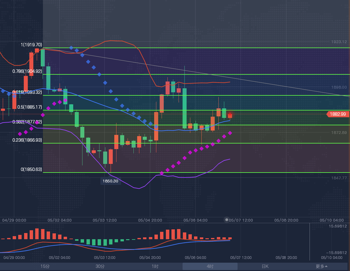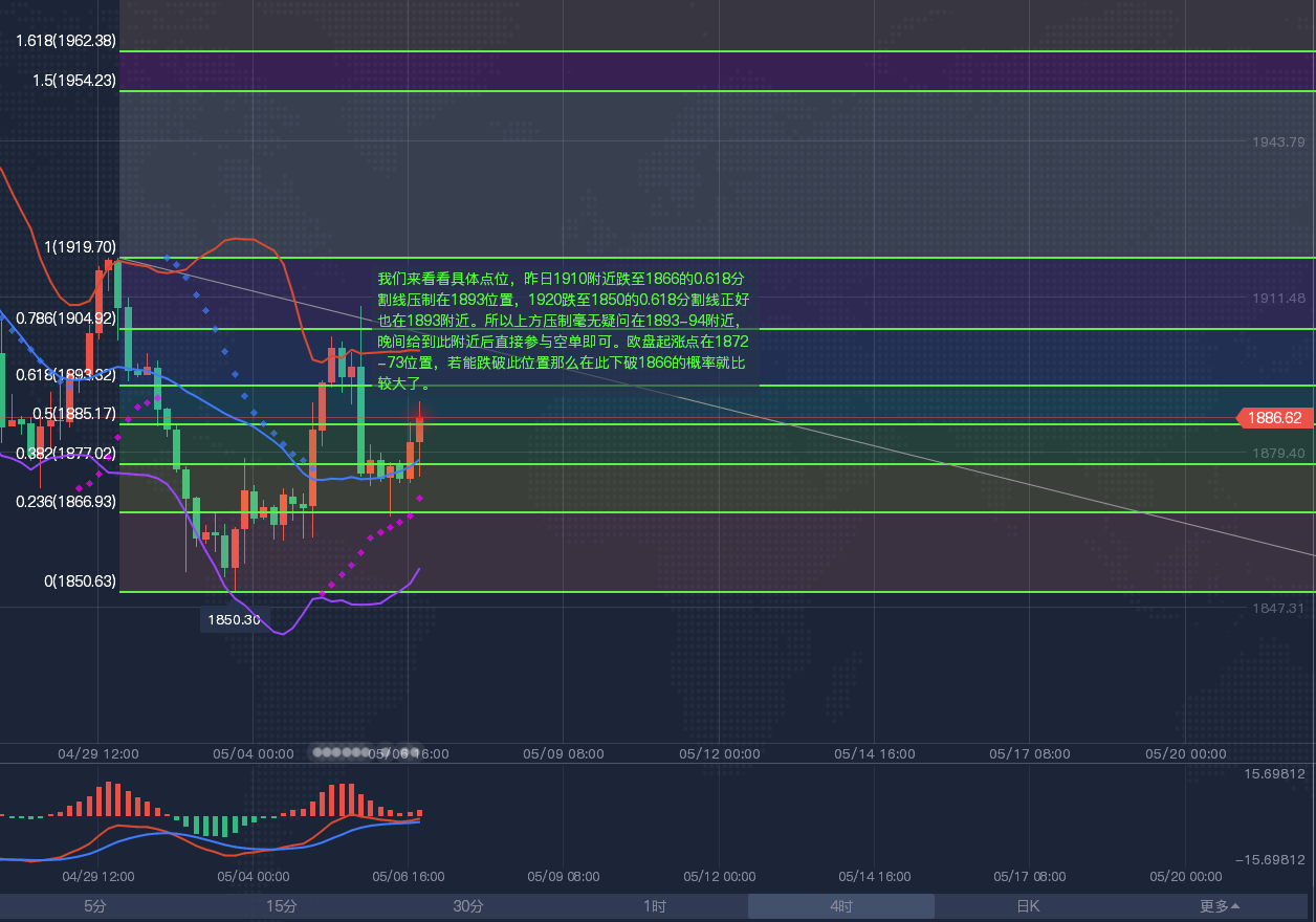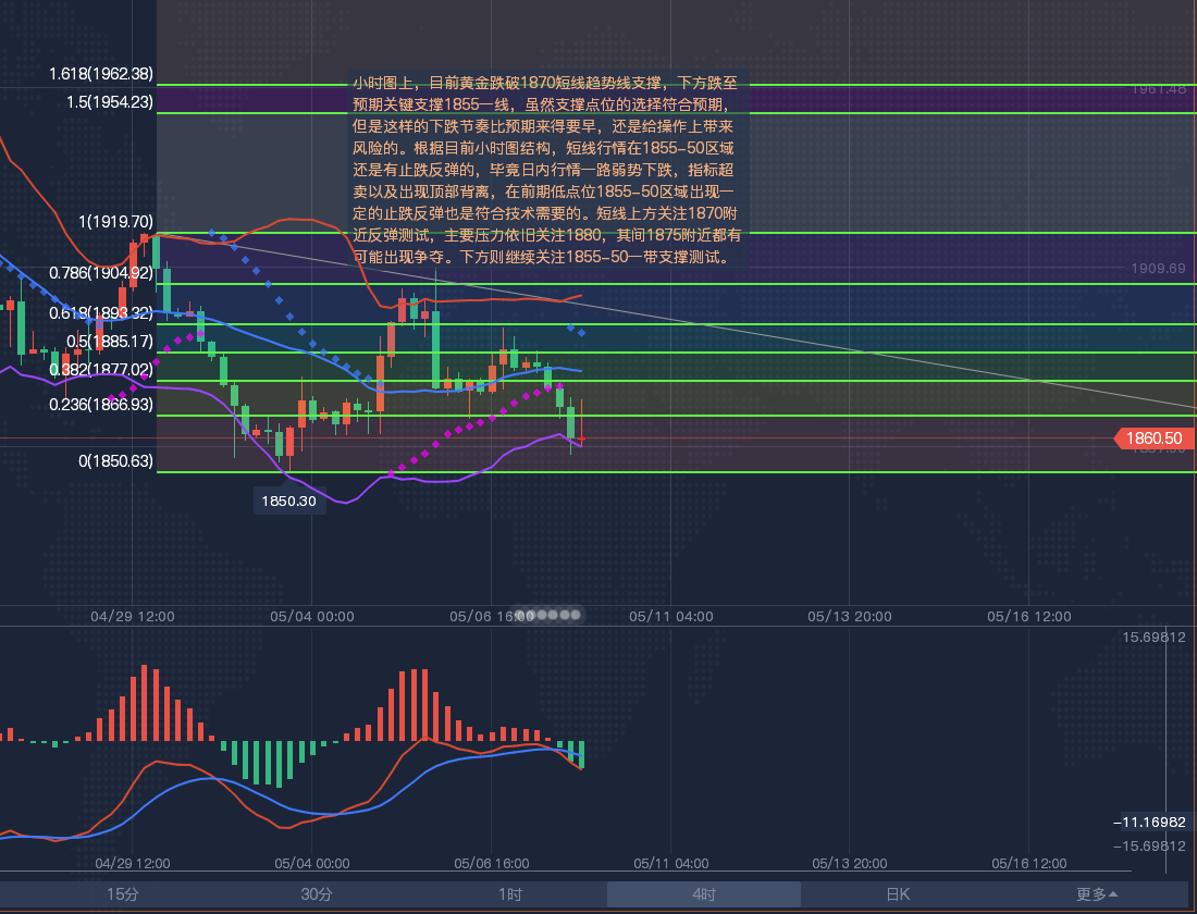 【黄金分析-美黄金】 黄金4小时级别震荡;留意布林线轨道1852-1900区域突破情况;目前KDJ向下发散,ACD初步死叉,留意1850附近支撑,如果失守该位置,则短线偏向再度跌向布林线下轨1840附近,能否进一步下破,还有待观察。A5—A10均线维持死叉下行态势,布林带下轨依然向下开口运行,下方还有一定的