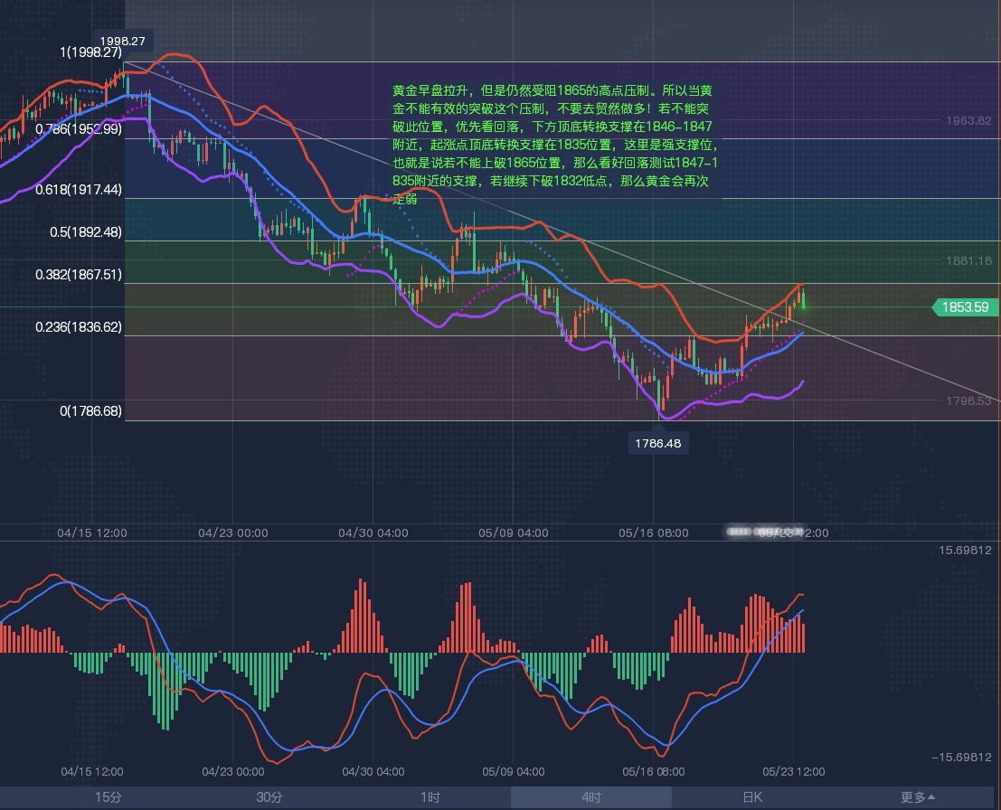 【黄金分析-美黄金】 黄金周一早盘受消息面的影响短线拉升,目前最高触及1865附近承压,早盘整体偏强走势,不要着急追。黄金早盘拉升,但是仍然受阻1865的高点压制。所以当黄金不能有效的突破这个压制,不要去贸然做多!若不能突破此位置,优先看回落,下方顶底转换支撑在1846-1847附近,起涨点顶底转换