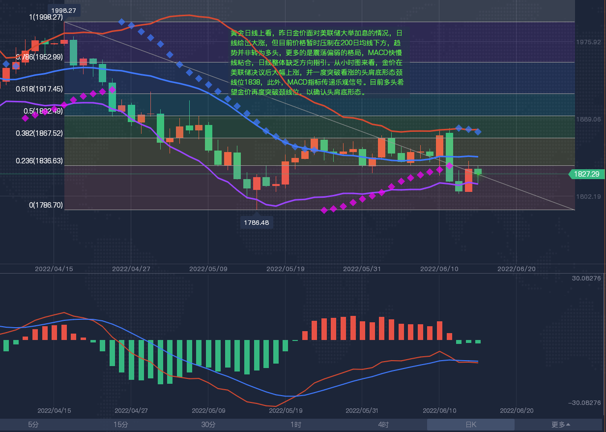 【黄金分析-美黄金】 周四(6月16日)亚市盘中,现货黄金在昨日大涨之后小幅回落,但保持在1830美元/盎司上方。美联储周三宣布一口气升息3码,为1994年以来首见最激进的升息幅度,符合市场预期。股主要指数隔夜震荡走高,16日亚市早盘,黄金拉高1835美元继续走扬,美元则在20年高点重挫。