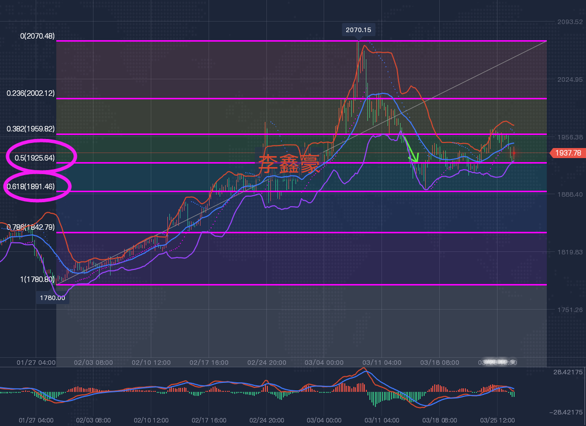 【黄金分析-美黄金】 黄金从技术面来看,日线级别震荡;均线交织,ACD死叉,KDJ轻微金叉,短线走势缺乏明确方向,留意1890-1966区域突破情况。鉴于周一中阴线利空影响仍在,21日均线对金价形成压制,在顶破21日均线1952.82前,后市偏向震荡下行,初步支撑在周四低点1918.90附近,3月22日低点支撑在1910