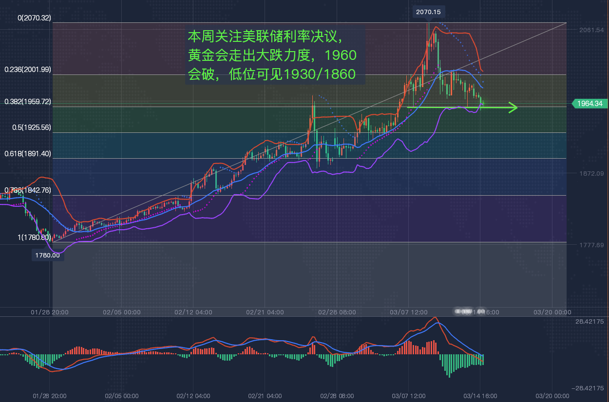 周一(3月14日)俄乌第四轮谈判拉开序幕,对乌克兰问题和平谈判取得进展的希望则提振风险偏好,避险需求回落,而美元受美联储加息临近支撑保持坚挺,黄金持续回落失守1960美元,日内一度大跌超20美元。市场正在等待美联储决议的到来。 周一欧市盘中,现货黄金跌势进一步扩大,远离上周的高点2069美元。金