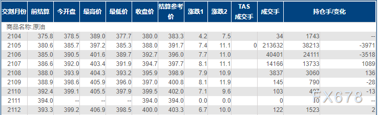 周一(3月29日)上海原油价格冲高回落,盘中一度暴涨4.36%至397.2元/桶,但亚洲时段受到长赐号成功脱浅的拖累,油价大幅回落。主力合约2105终盘收于388元/桶,涨7.4元/桶,涨幅1.94%。消息人士称,“长赐”号货轮在苏伊士运河搁浅近一周后上浮,目前已启动引擎。消息人士表示,“长赐”号的船身已经摆正,在移动前将接受