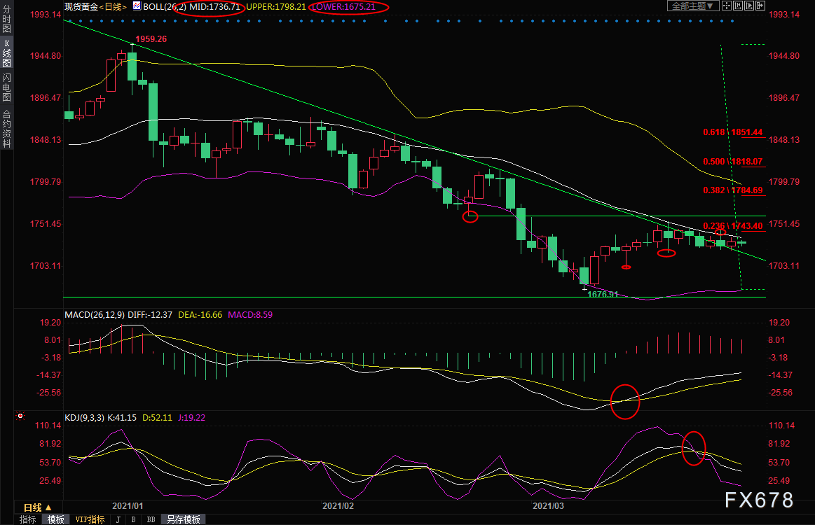 周一(3月29日)亚洲时段,现货黄金窄幅震荡,全球股市的上涨和美元的坚挺令金价承压,但美债收益率低开等因素,金价仍守在1730关口附近,技术面来看,短线走势变数依然较大,略微偏向震荡下行。 日线级别:震荡下跌;ACD金叉,KDJ死叉,均线交织,近几个交易日波动较小,意味着短线走势变数较大,由于布林线中轨等多