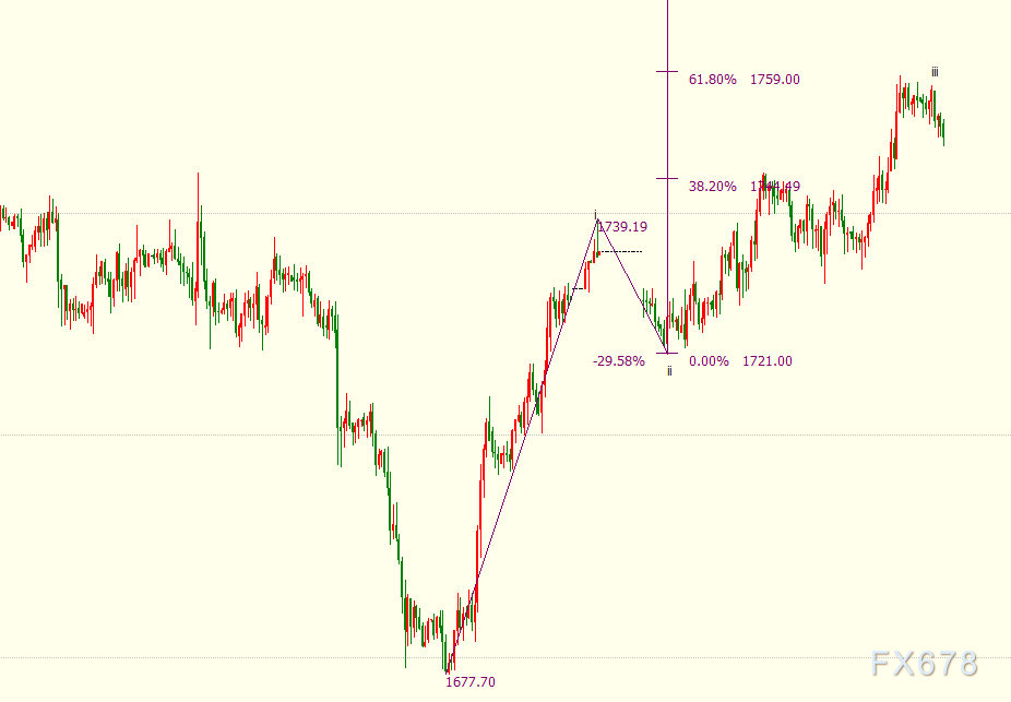 昨天金价强势拉升,最高到了预期的1758一线,但尾盘并没有按我们的预期出现大幅下跌,而是复制了周三的格局强势横盘,从这一点来看对于近两天的判断失败,时间上没有走出向下变盘30块,反而是向上变了,哪对于这种情况我们就要重新调整思路,一日图大阳价格到达日图上线也靠近了布林轨道的上轨,在昨晚说了12点如果不