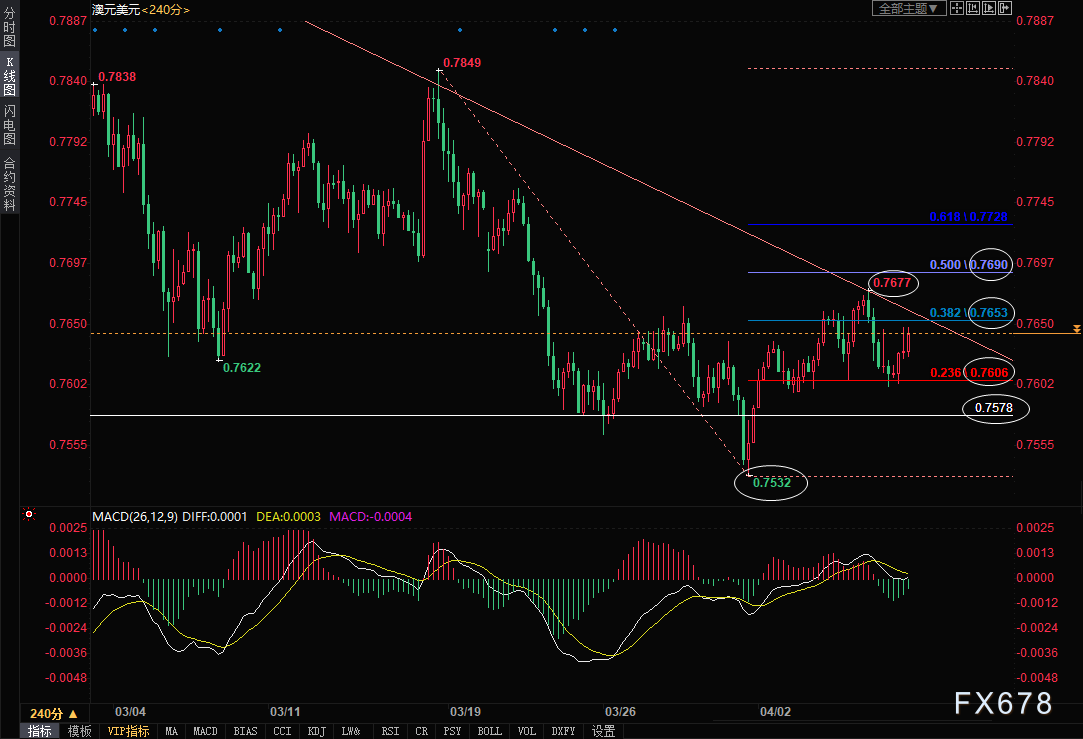 在跌至三个月新低0.7531后,澳元重拾涨势,在反弹至0.76上方后,澳元似乎在0.7700附近面遭遇了强劲的卖压。 从四小时图来看,澳元在升创半个月新高之后逐步下跌,最后受到了0.7849-0.7532区间23.6%斐波拉契回撤位0.7606一线的支撑反弹。 上方目前面临38.2%回撤位0.7653及下行趋势线的双重压力,短期可能