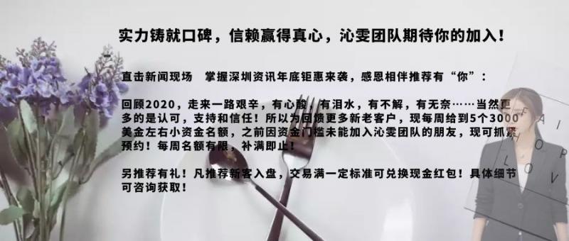 实力铸就口碑,信赖赢得真心,沁雯团队期待你的加入! 年底钜惠来袭,感恩相伴推荐有“你”: 回顾2020,走来一路艰辛,有心酸,有泪水,有不解,有无奈……当然更多的是认可,支持和信任!所以为回馈更多新老客户,现每周给到5个3000美金左右小资金名额,之