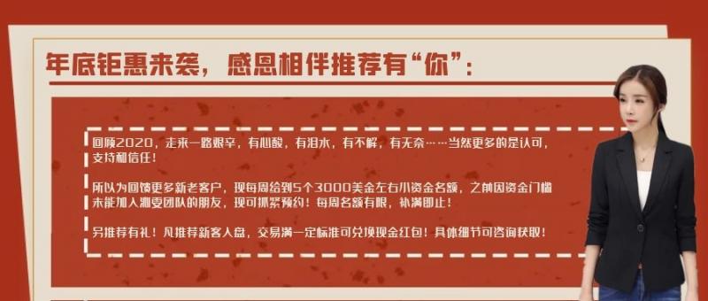 实力铸就口碑,信赖赢得真心,沁雯团队期待你的加入! 年底钜惠来袭,感恩相伴推荐有“你”: 回顾2020,走来一路艰辛,有心酸,有泪水,有不解,有无奈……当然更多的是认可,支持和信任!所以为回馈更多新老客户,现每周给到5个3000美金左右小资金名额,之