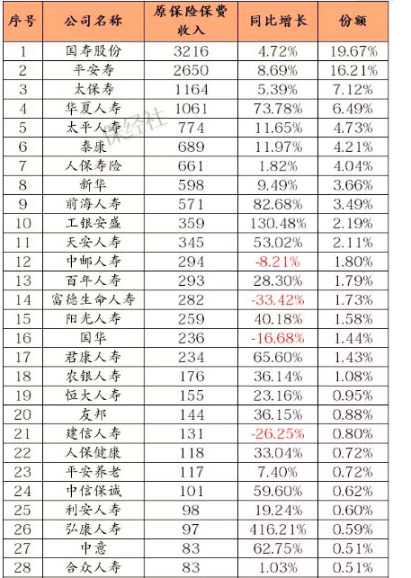 2019年1-5月人身保险公司原保险保费收入1.63万亿元,同比增长15.61%。 从保险公司看,前四家公司市场份额接近50%。在91家公司中,20家负增长。 2019年1-5月寿险公司原保费收入情况:
