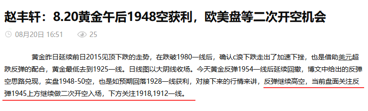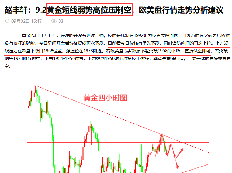 黄金今天1950空,午后如预期下行1927一线获利,昨日黄金反复震荡之后冲高回落,跌破1959美元支撑进一步下跌,尾盘持续弱势最低下跌触及到了1932美元一线,日线收阴线,今天早间博文分析也是给出做空的思路,午后下跌1927一线获利收割,实力全网都见证。 黄金早盘最高反抽到1951附近后就开