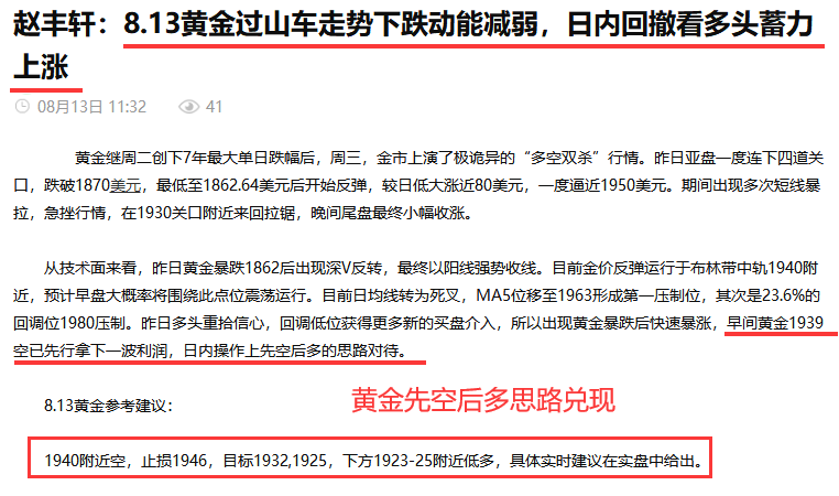 交易做的好不好,以结果说话,以事实说话,本周行情跌宕起伏,实盘操作上有亏有赚,要稳得住止损的痛心,才等的来胜利的曙光。今天早间提示1939空到1930获利,午间1929-30多止损出局后,1926多到1935获利落袋,晚间提示的1924多如期上涨,原油今天42.8空下行42.3一线获利。 黄金在经过周二暴跌11