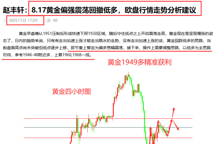 黄金昨日早间自1962一线下跌后,行情就始终在1940-1957区间波动,欧盘博文分析中给出的1938-40多思路如期上涨兑现利润。我们实盘1945连续提示的多单到1955获利,1940多单到1951获利,多单全部拿下利润,精准把握趋势,把握好节奏和进场点位,跟随丰轩获利不迷茫! 回顾本周行情,周一市场震荡反复,收线