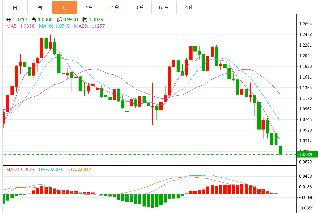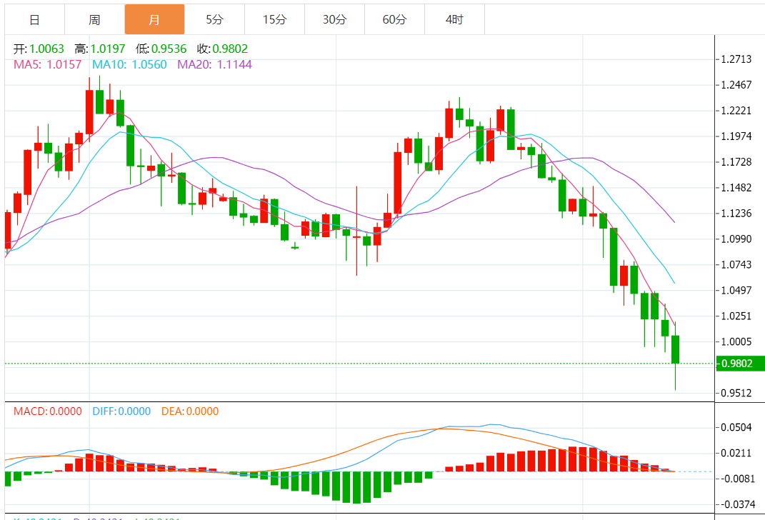 9月欧元/美元汇率走势回顾 9月截止发稿,欧元/美元下跌2.45%,连续4个月走低,目前位于平价关口下方,最低位于0.9594附近,其中主要受美元走强影响较大。 欧元已跌到二十年来的低点。彭博社的数据显示,今年上半年,欧元贬值了12.05%;过去一年,欧元对美元的跌幅为15%,日前直接跌破1比1关口,创近二十年新