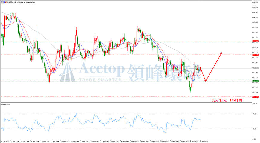 如图所示,在美元/日元1小时周期中,日内趋势方向以看涨为主。重点留意102.62一带的支撑能否跌破,若不跌破102.62,美元/日元有望企稳。当前分析思路上可密切关注以昨日低点102.75能否形成1小时级别的折返上涨趋势,若能形成,基本可确定趋势企稳。指标上,MA13均线、MA21均线和MA72均线相互交织,均线上并无明显的交易信号,建议投资者在等待价格回调到102.90附近尝试做多。