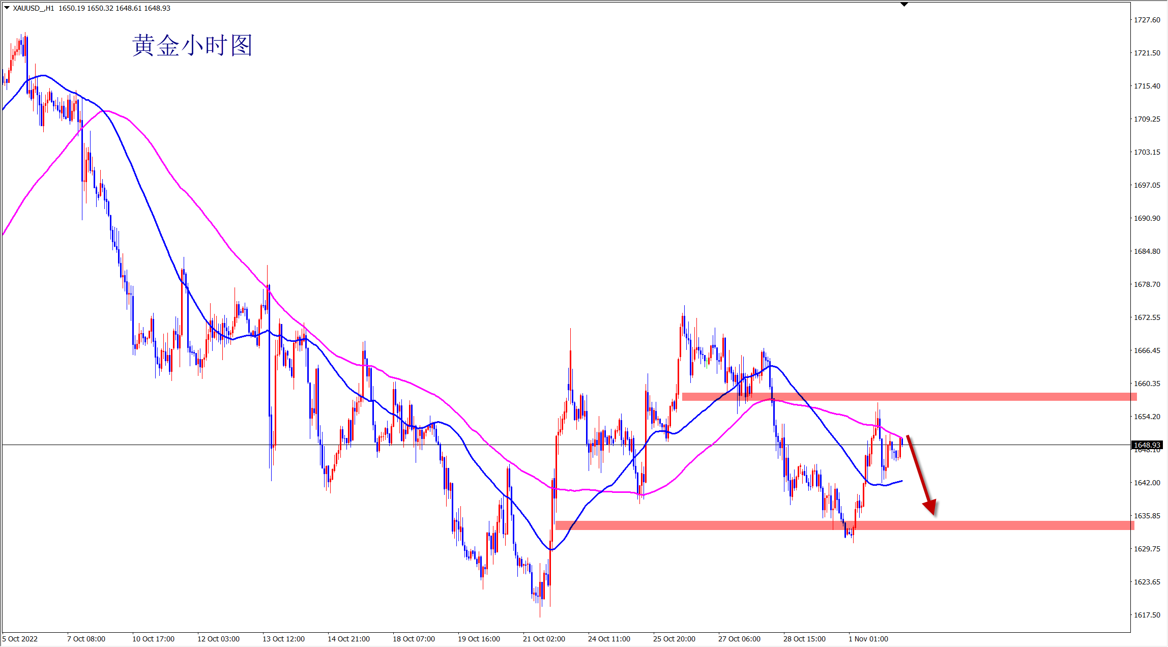 黄金今日一改前期强势上涨走势,日内弱势阴跌,并且跌破1745后震荡,上涨趋势改变,行情转跌,美盘反弹1750附近空了!