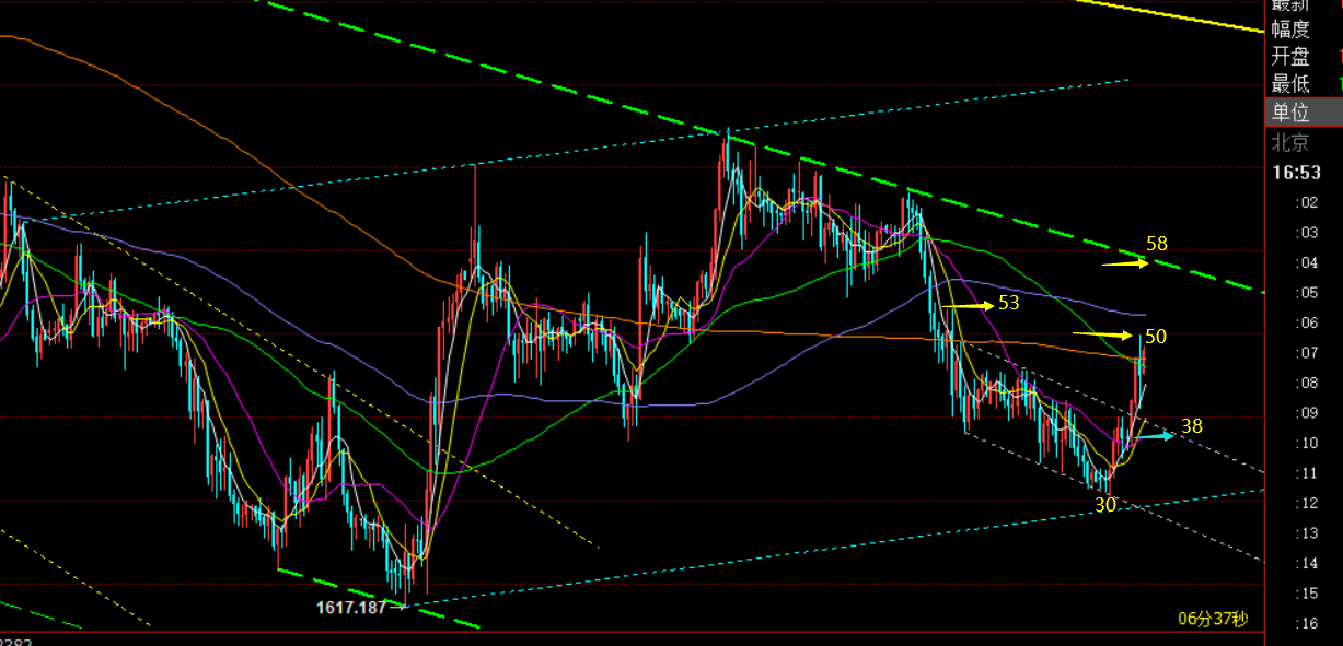 第三,黄金小时线级别:今日早盘触及通道上轨,出现承压迹象后,果断1652通知继续空,震荡慢下行压制,欧盘来了短暂的大阴小加速破底,最低1636,成功于1640预期目标拿下;那么欧盘一路下跌后,美盘前后一旦出现反弹则判断为诱多,就是再次做空的时机,阻力点参考618分割阻力1648一线,通道上轨阻力有所下移至1650一线,因此1650下逢高可以接着空;有些朋友若激进想参与短多博反弹的,建议可以关注1633-34处,或存在一定趋势衍生支撑(1642、1640两点连线);这里若守不住,则要试探1622-20一线,甚至前低1614;