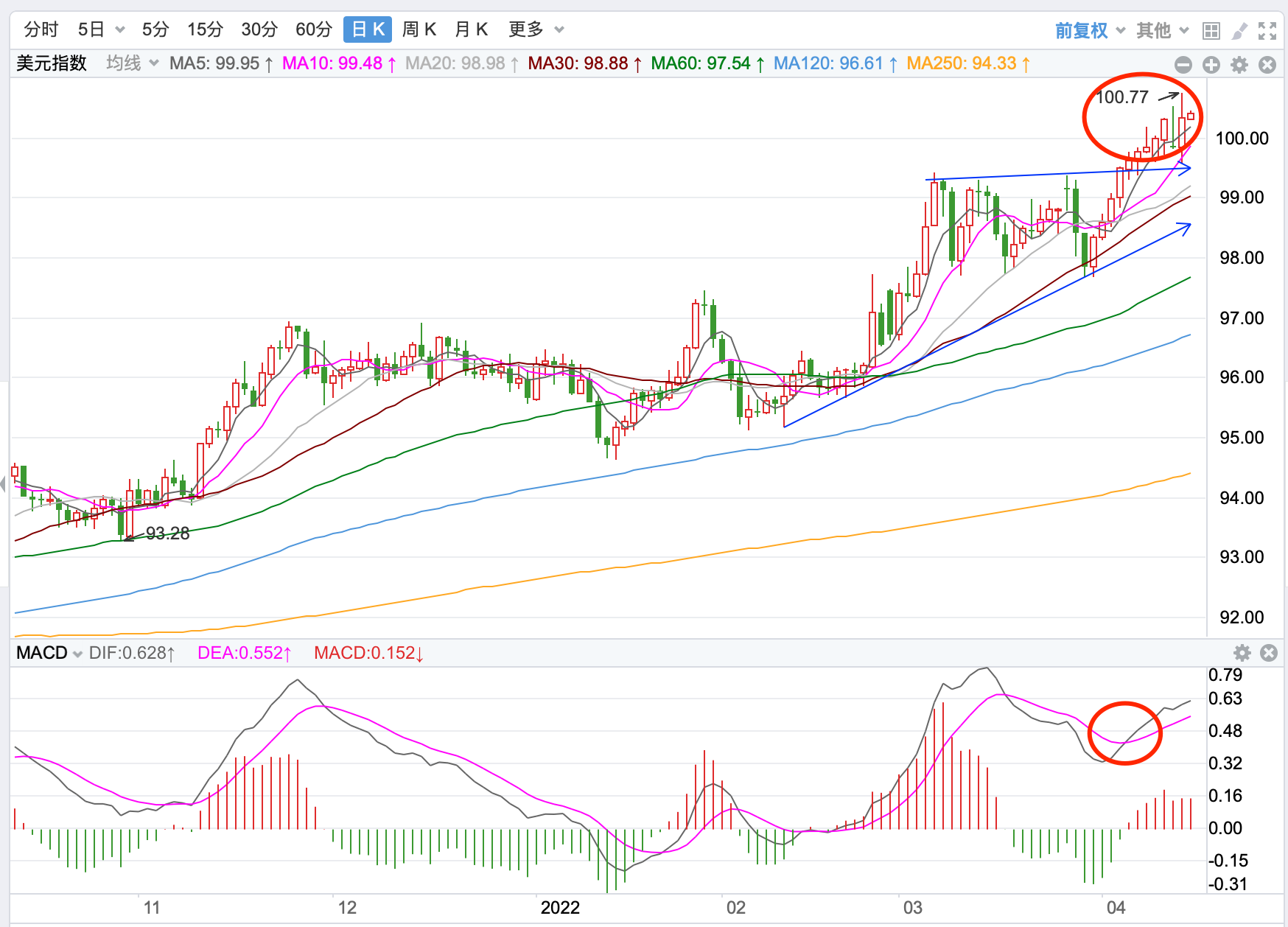 美元指数前期一路上行创出102.99的新高,后一路震荡回落。当前再次受支撑反弹,整体价格在MA200上方运行,短线呈震荡反弹走势。而前期低点对应的价格92.00变成当前行情的强支撑位,也是后市的多空分水岭,如果此支撑有效,后市会继续反弹走势。日内阻力在92.70,支撑位:92.00、91.50。