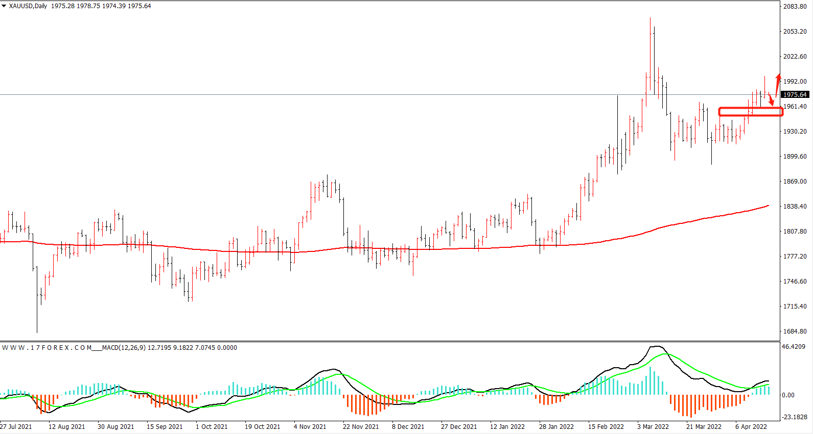 现货黄金价格从1445的前期低点一路展开上行,创出之前2075的新高后,先回落后持续震荡下跌达到六个多月。当前整体价格在MA200上下运行,MACD指标弱势震荡,目前形成震荡走势。当前重要阻力对应的价格1750的强压力位已经突破,行情取得较大的上行空间,黄金是继续上涨走势。