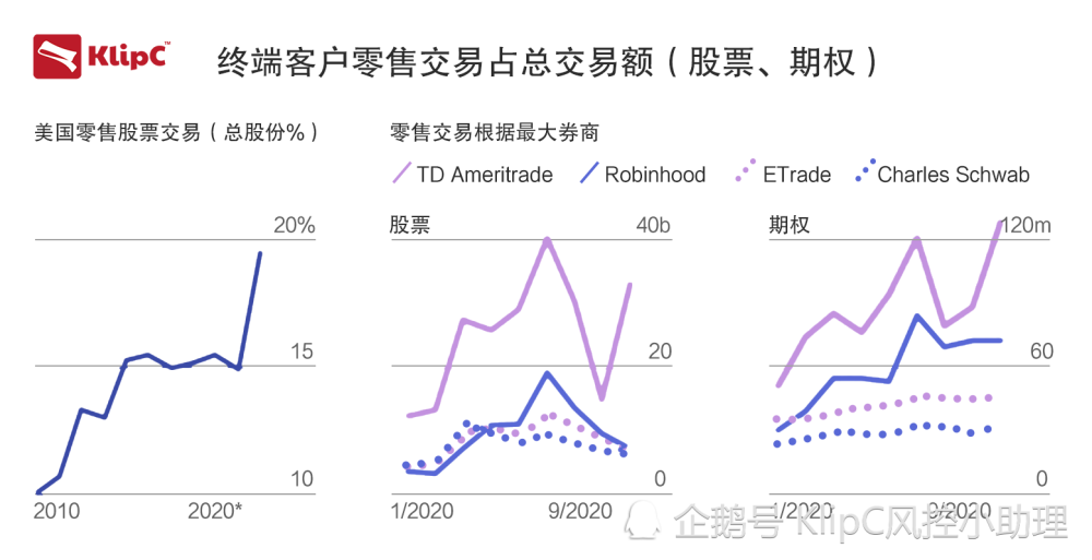 在券商间的竞争和成本下降的推动下,今年零售平台的交易激增。像Robinhood这样的新进入者为抢占市场份额而向投资者提供了自由交易的机会,迫使像E * Trade和Charles Schwab这样的老牌公司效仿他们的做法,进行自我保护。 KlipC的风险经理Philip Nucci说:“今年金融交易在年轻一代中变得非常流行,加密货币是领军者,尽管大多数人不知道交易涉及的风险,但通过网络交易来赚钱成为了互联网上的热门话题。”
