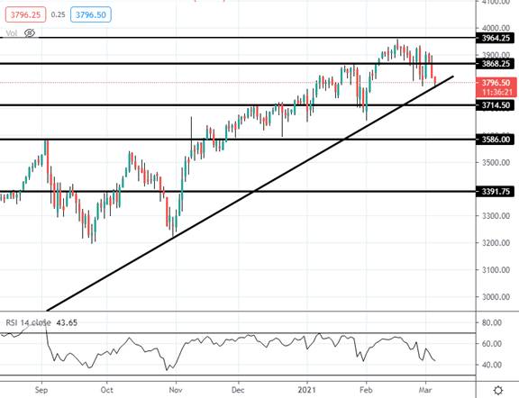 标普500指数本周将继续走低。价格目前正在测试上周的低点,以及自2020年低点以来的上升趋势线,这虽然完好无损,但仍保持近期偏向看涨。但是,如果价格跌破该水平,则要注意的下一个水平是3714.50和其后的3586。