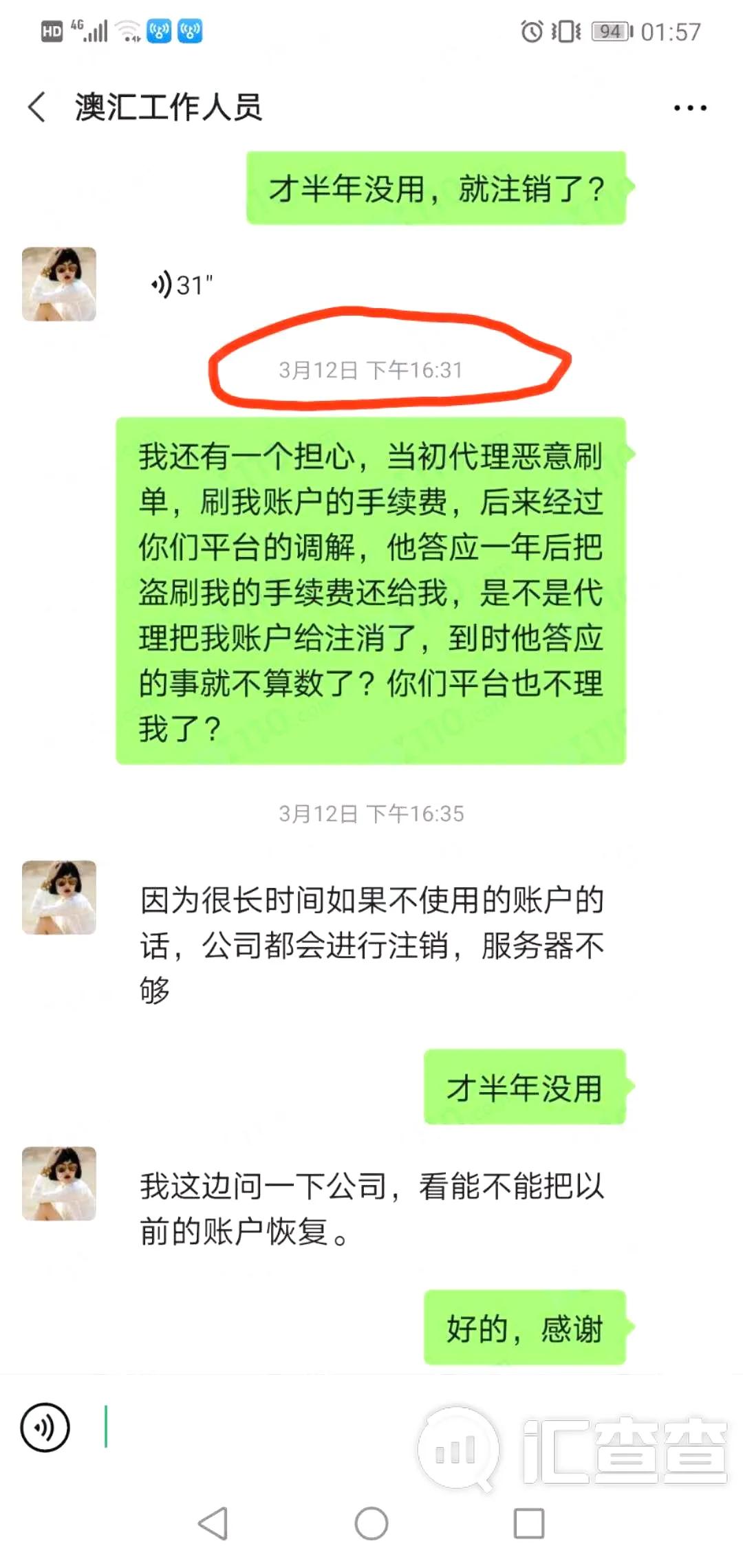于是赶紧咨询了澳汇平台工作人员。工作人员再次宽慰了汇友,说会向公司反应,看能不能帮汇友恢复……这之后又不了了之。