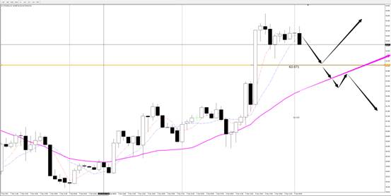 若日内原油运行能够再次回探至静态多空分界(63.071)支撑附近有效站稳(阴线下影线+阳线下影线)并于盘中寻找出动能由空至多转换迹象,则可考虑参与多单进场。若周五原油上涨动能得到遏制或受出货性行情影响,导致油价回落并有效突破至小时图级别动态多空分界下方且走出有效下破四部曲形态(力度性下破并收线、开线、做上影线、翻阴),则可考虑参与空单进场。