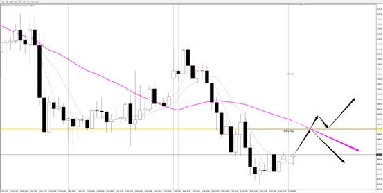 行情有效承压(做出阳线上引线+阴线上影线)动静态多空分界压力,并且在盘面上寻找出动能由多至空转换迹象,则可考虑布局空单进场;若行情通过有效上破四部曲(力度性上破并收线、开线、做下影线、翻阳)有效突破并站稳动静态多空分界上方,则考虑布局多单进场,但考虑近期黄金整体趋势偏空,切勿过夜持仓。