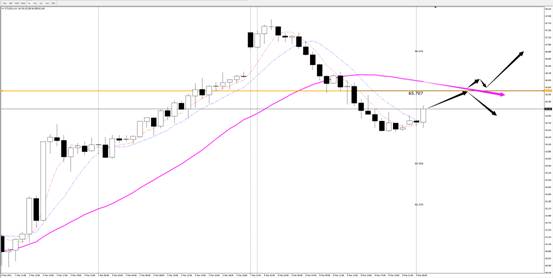 行情反弹起来有效承压静态多空分界(65.707)压力做出有效承压形态(阳线上影线+阴线上影线)并且在盘面上做出动能由多转空迹象后,考虑参与空单进场;若行情持续上破来至动态静多空分界上方,且做出有效上破四部曲形态(力度性上破并收线、开线、做下影线、翻阳)后考虑参与多单进场。