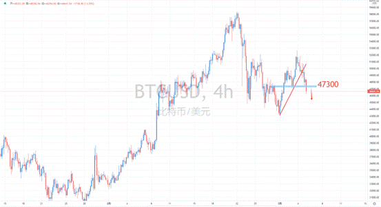 【技术分析】:H4周期显示,价格处于趋势线下方运行,建议投资者可考虑47300附近做空,止损48000左右,止盈46000左右。