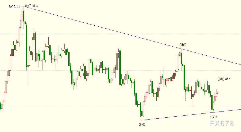 日线图上看,金价处于自1785美元开启的上行((d))浪,上方目标位看向1915美元附近。((d))浪隶属于自2075美元开启的调整4浪。4浪呈现三重三锯齿形结构,可细分为((a))((b))((c))((d))((e))五子浪。